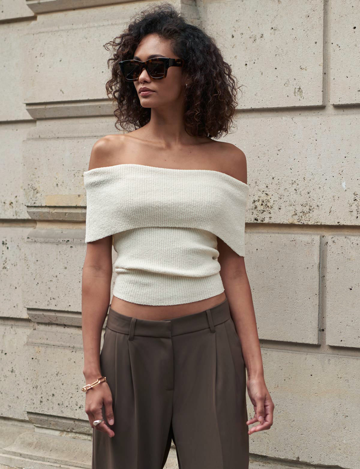Textured soft knit off the shoulder fold top .