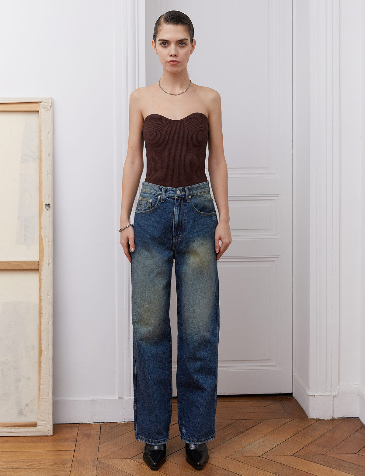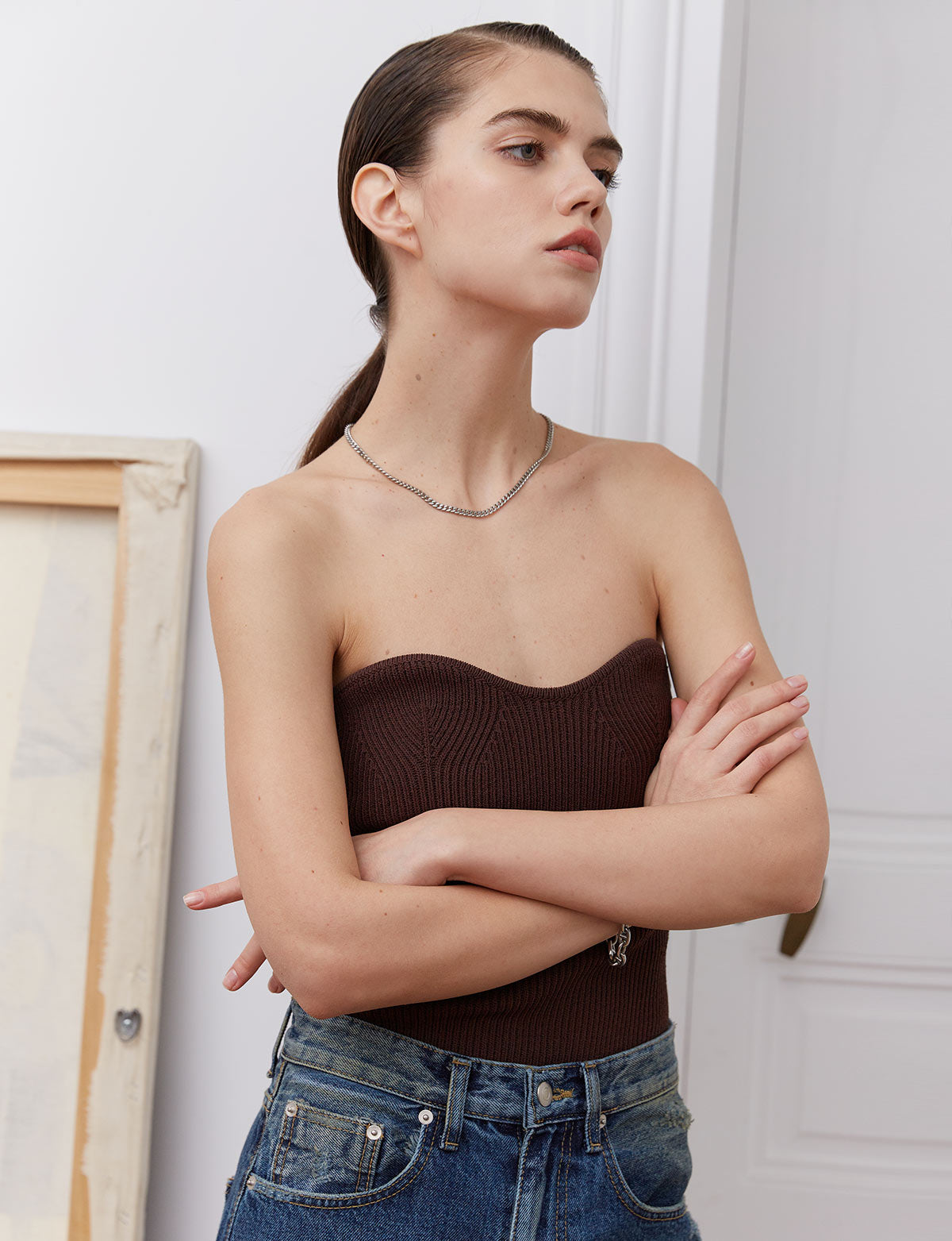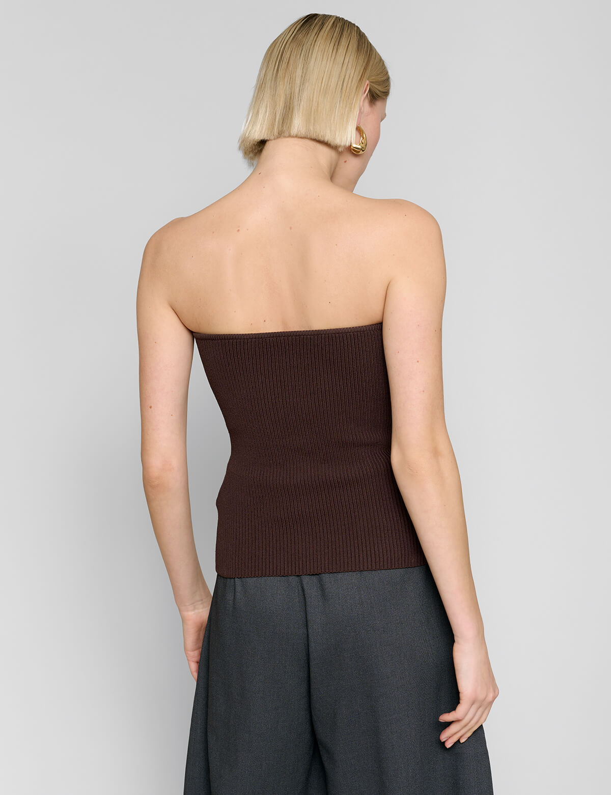Structured thick chocolate brown knit strapless bustier top . Make a statement in this sweetheart neckline knit top.