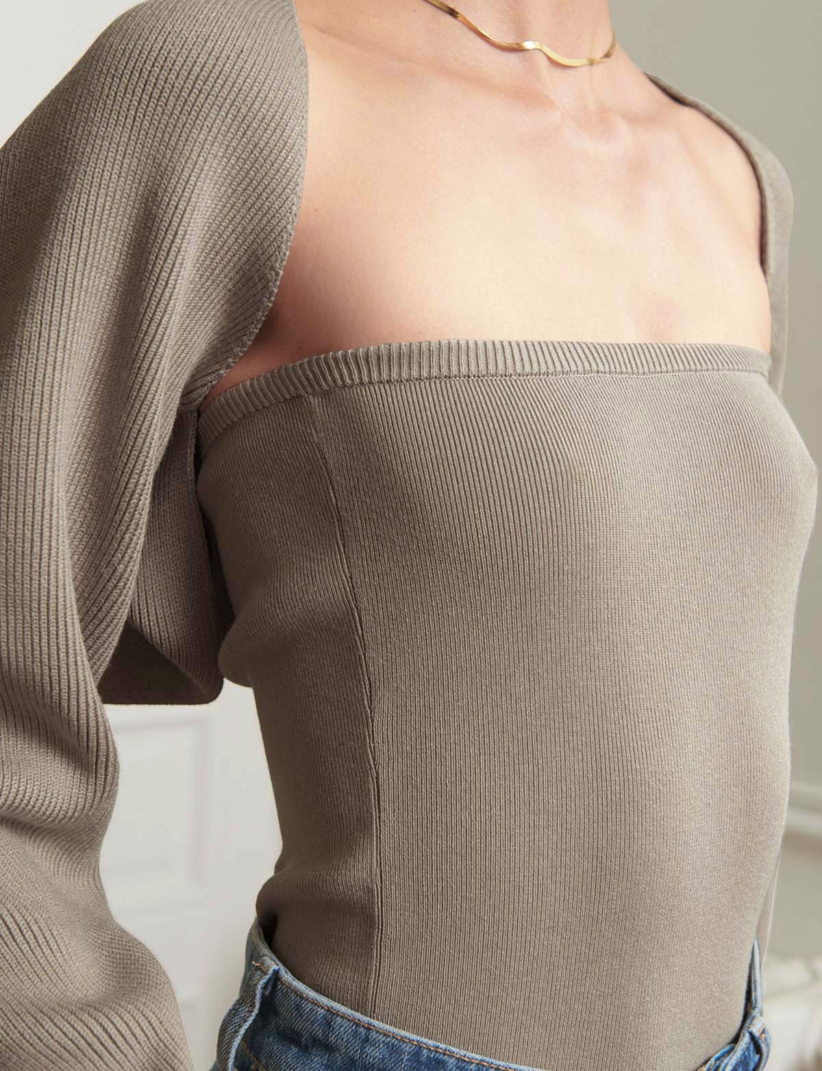 Soft strapless knit top with detachable knit bolero in pebble color . Wear it together or separately .